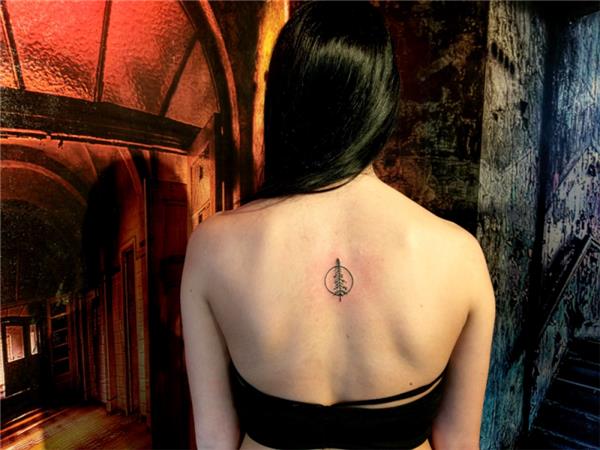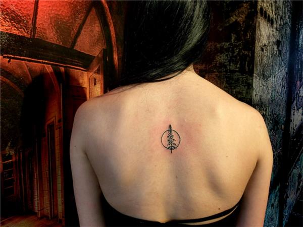 Çember içinde Çam Ağacı Sırt Dövmesi / Pine Tree Circle Tattoo Back, Sırt Dövmeleri, Dairesel Çember Geometrik Dövmeler, Minimal Dövmeler, Minimal Tattoos, Ağaç Dövmeleri, Pine Tree Tattoo