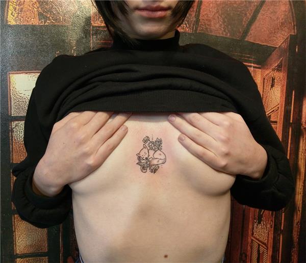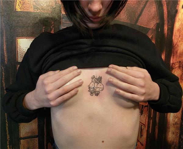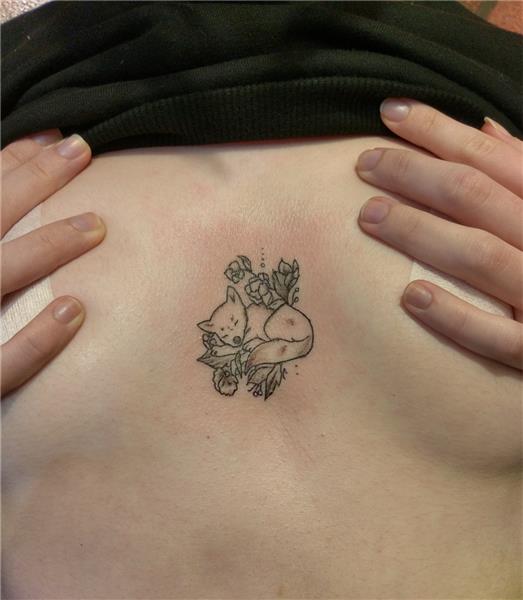 Çiçekler Arasında Uyuyan Tilki Dövmesi / Flowers and Sleeping Fox Tattoo, Tilki Dövmesi, Hayvan Dövmeleri, Animal Tattoos, Fox Tattoo, Göğüs Arasına Dövme, Çiçek Dövmeleri, Tilki Dövmeleri