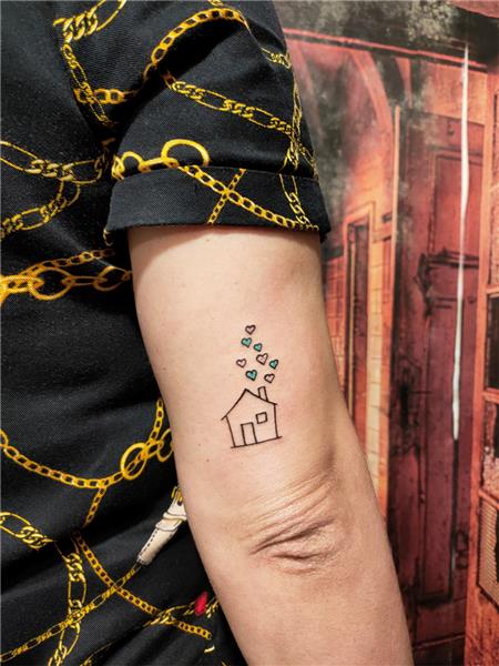 Çizgisel Ev ve Kalpler Dövmesi, Line House and Hearts Tattoo, Çocuk Çizimi Ev Dövmesi, Çizgisel Ev Dövmesi, Renkli Kalpler Dövmesi, Colourful Hearts Tattoo
