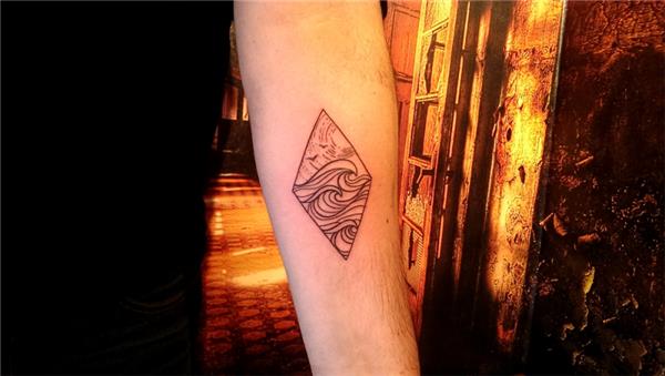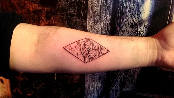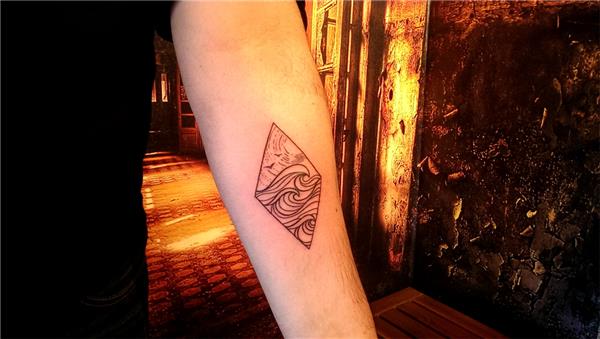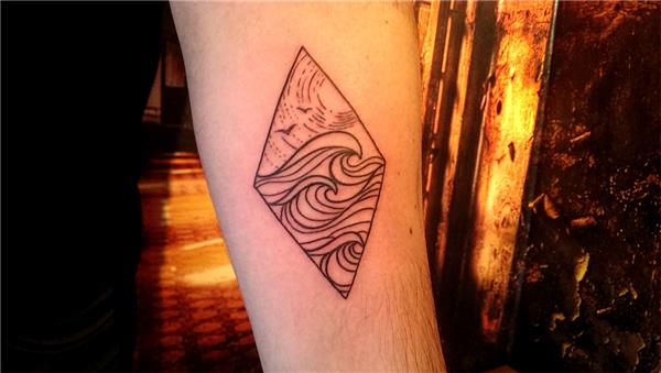 Dalga güneş martılar dörtgen geometrik çizgi tekniği dövme, Waves, sun, birds, line work tattoo, kol dövmeleri, geometrik çerçeve içinde dövmeler