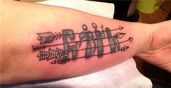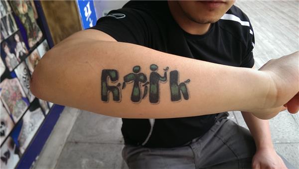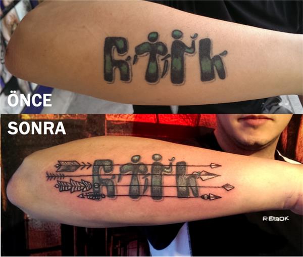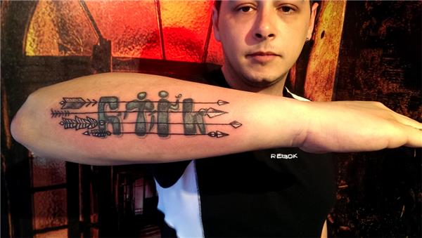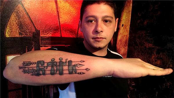 Yazı üzerine oklar yapılmıştır yazının rengi açılmıştır, Göktürkçe Türk ve Oklar Dövmesi, Arrow Tattoos, Ok Dövmeleri, Kol Dövmeleri, Yazı Dövmeleri, Türk anlamında dövmeler
