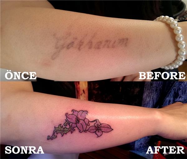 Lazer ile dövme silme işlemi sonrası Gökhanım isim dövmesinin izlerinin çiçek dövmesi ile kapatılması Dövme Kapatma Lazer ile Dövme Silme İşlemi Sonrası Lazer İzi Kapatma Dövme İzi Kapatma İşlemi