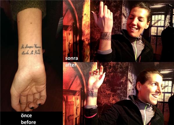 Bilek yazı dövmesi üzerine dantel motif bileklik dövmesi, tattoo cover up, gabriela pugliesi tattoo