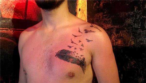 Gizem isim dövmesi kapatma, göğüs üzeri isim dövmesi kapatma, tüy ve kuşlar ile dövme kapatma, cover up tattoo