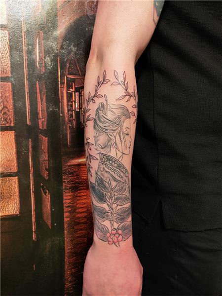 Japon Kızı ve Kahve Çiçeği Dövmesi, Japanese Girl and Coffee Flower Tattoo, Kız Dövmeleri, Girl Tattoos, Japon Dövmesi, Kahve Dövmeleri, Coffee Tattoos, Yaprak Çelenk Dövmeleri, Kol Dövmeleri, Büyük Dövmeler