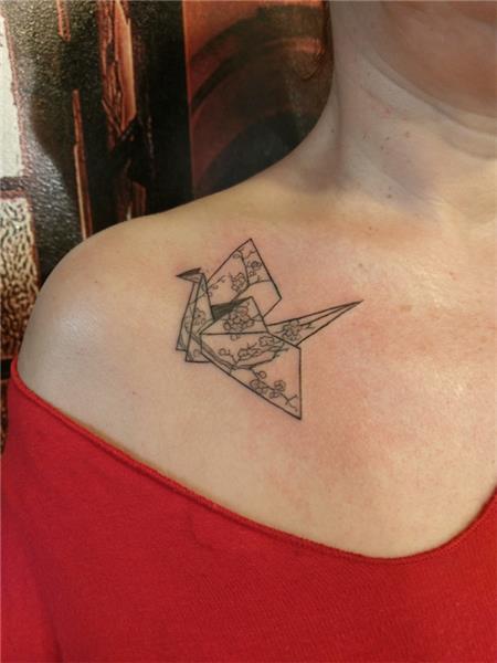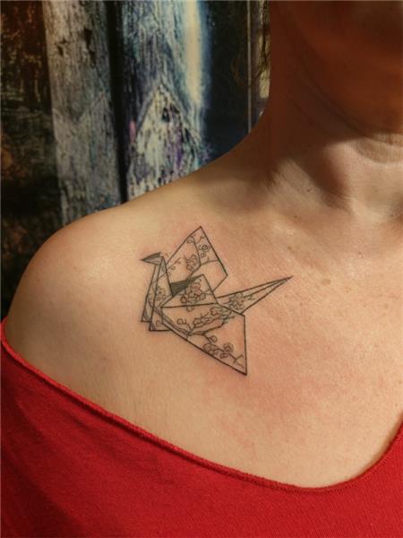 Kağıttan Kuş Origami Turna ve Sakura Dövmesi / Paper Bird Origami Flapping Bird and Sakura Tattoo, Omuz Dövmeleri, Kağıttan Kuş Dövmeleri, Origami Dövmesi, Origami Tattoo, Sakura Desenli Origami Kağıttan Turna Kuşu Dövmesi