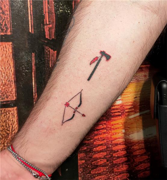 Kızılderili Balta ve Ok Yay Dövmesi, Indian Axe and Arrow Bow Tattoo, Kırımızı Siyah Dövme, Ok Dövmesi, Balta Dövmesi, Kızılderili Dövmesi, Native American Tattoo