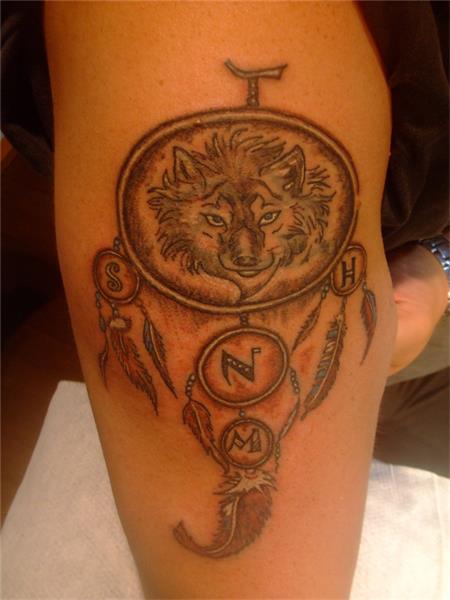 Kurt ve Düş Kapanı Dövmesi, Wolf and Dream Catcher Tattoo, Kızılderili Dövmeleri Rüya Kapanı Tüyler ve Harfler