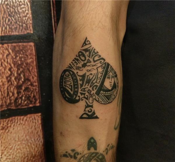 Maça İskambil Kağıdı ve Yazılar Dövmesi, Spade Tattoo, İskambil Kağıdı Dövmesi, Maça Dövmesi, Kol Dövmeleri, Spade Tattoos, Reyna Dame Queen Dama Tattoos, Gamble Tattoos