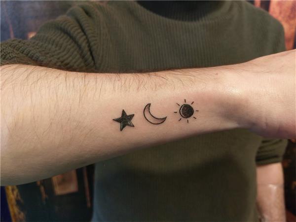 Minimal Yıldız Ay Güneş Dövmesi, Minimal Star Moon Sun Tattoo, Sembolik Dövmeler, Bilek Dövmeleri, Yıldız Dövmeleri, Güneş Dövmeleri, Ay Dövmeleri