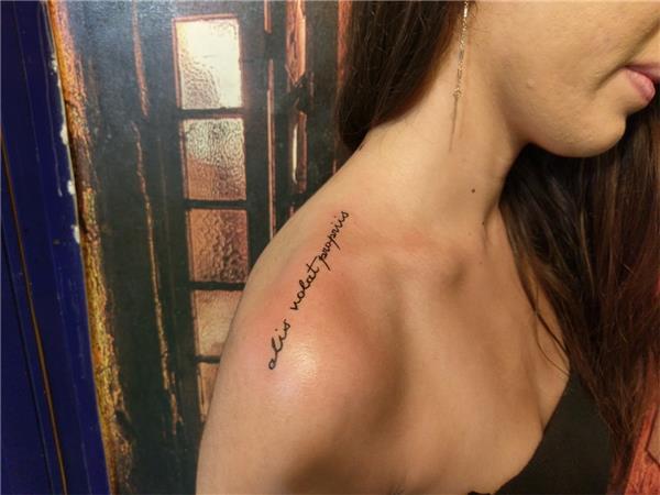 Omuz Üzerine Yazı Dövmesi, alis volat propriis latince dövme Kendi kanatlarıyla uçan anlamına gelir, Latin Tattoo, Omuz Dövmeleri, Latince Dövmeler, Latince Sözler Dövmesi