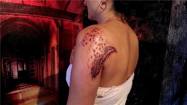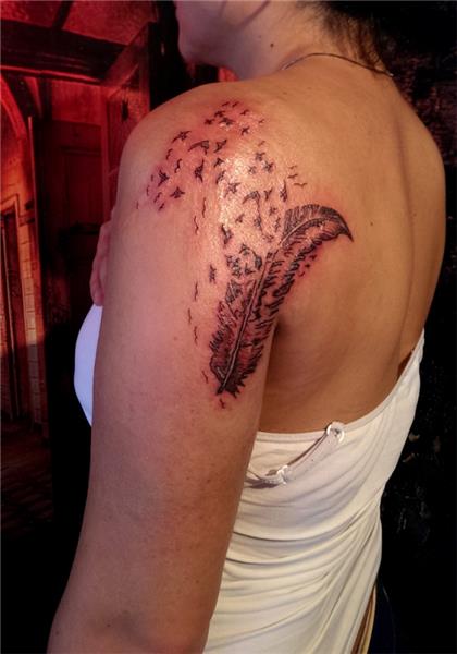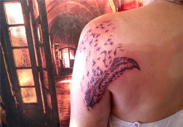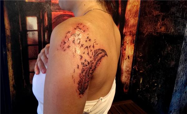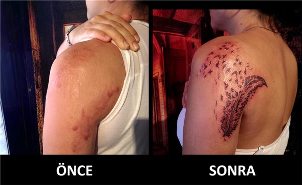 Kol omuz yanık yara izi dövme ile kapatma tıbbi kamuflaj dövmesi, Scar Tattoo, Tüy ve kuşlar dövmesi ile yanık izi kapatma