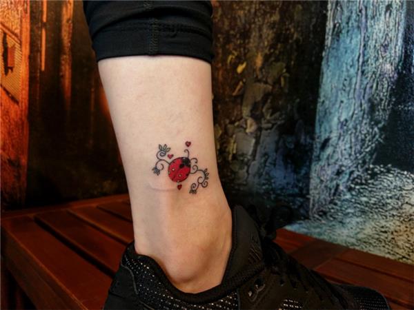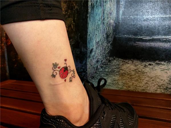 Uğur Böceği Kalp Sarmaşık Dövmesi / Ladybug Hearts and Leaf Tattoos, Ayak Bileğine Renkli Uğur Böceği Dövmesi, Ayak Bileğine Güzel Dövmeler, Kadın Dövmeleri