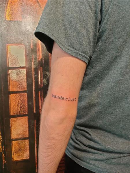 Wanderlust Yolculuk Tutkusu Anlamında Dövme, Wanderlust Tattoo, Yazı Dövmeleri, Kol Arkasına Yazı Dövmesi, Wanderlust Anlamı Nedir, Daktilo Kitap Yazısı Dövmeler