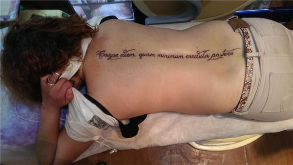 Latince sırt dövmesi Carpe diem, quam minimum credula postero. Anlamı , Günü yakala, yarına olabildiğince az güven.