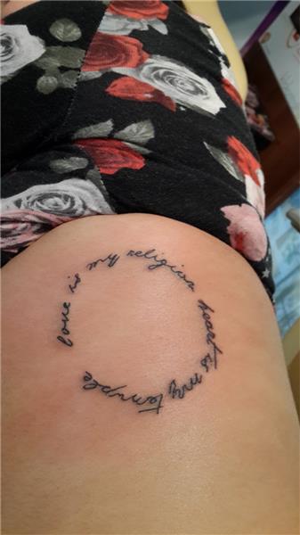 Love is my religion Heart is my temple tattoo, Aşk dinim Kalp tapınağım yazı güzel söz dövmesi, Circle Tattoo, Dairesel yazı dövmesi, Çember yazı, Eğik yazı dövmesi